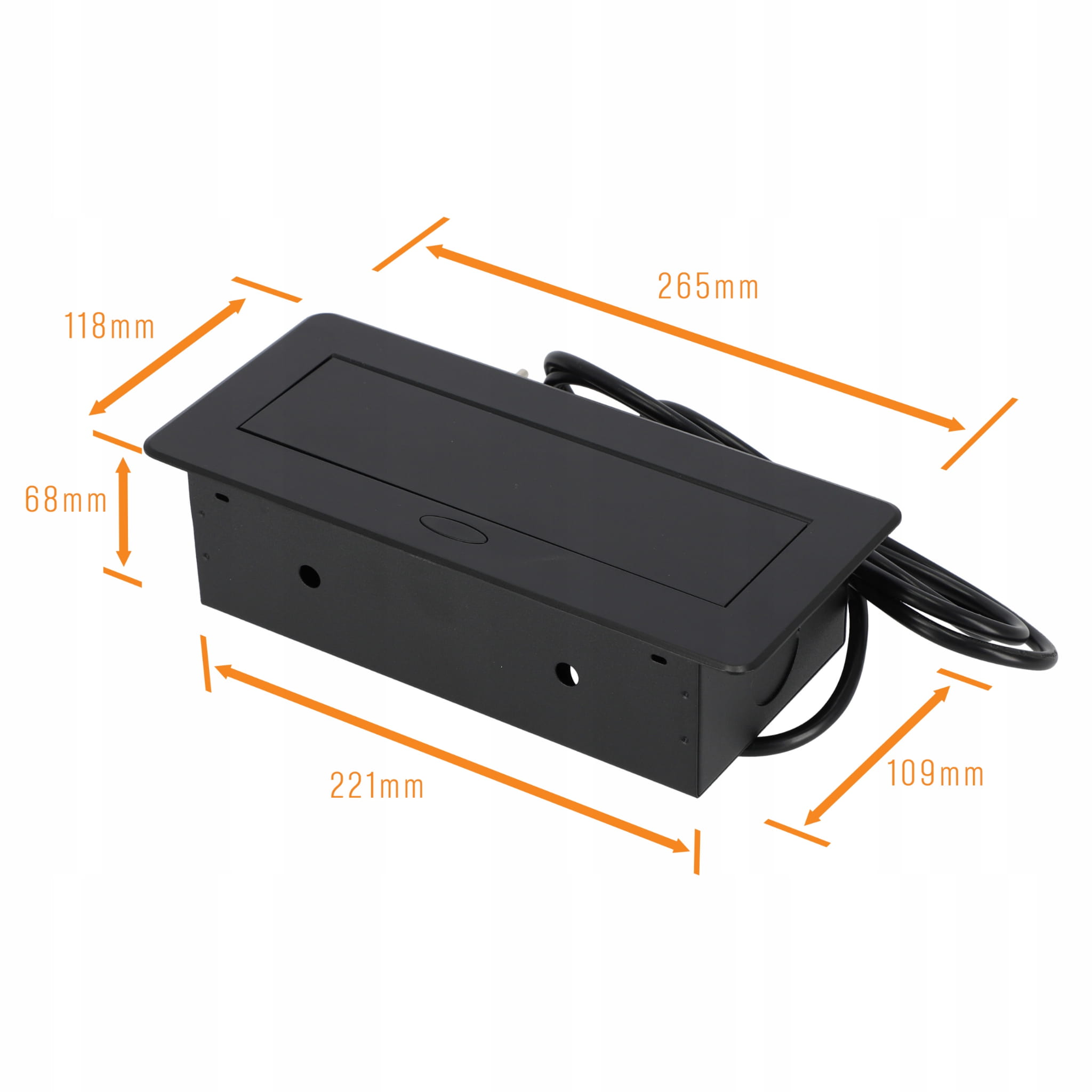 Gniazdko pasuje do większości blatów o standardowej grubości, ważne jest jednak, aby upewnić się, że wymiary otworu montażowego są zgodne z wymiarami gniazdka (221x109 mm).